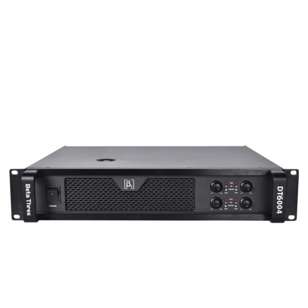 Overview: The Beta3 DT-6004 is a high-performance 4-channel Class D amplifier designed for professional sound reinforcement. Engineered for reliability and efficiency, this amplifier features an innovative thermal management system, automatic temperature control, and precise detection to ensure optimal performance in diverse audio applications. Its robust design supports a variety of power levels and includes advanced features for enhanced audio fidelity and operational flexibility.