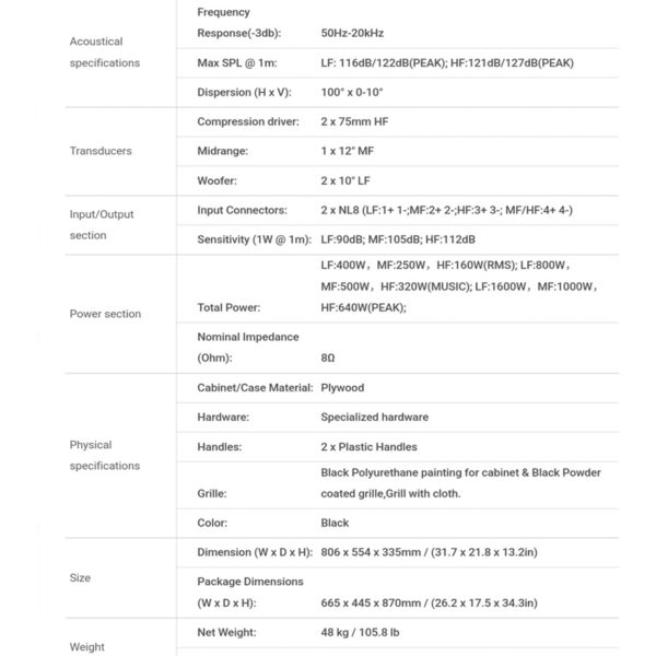 Max SPL @ 1m: LF: 116dB/122dB(PEAK); HF:121dB/127dB(PEAK)